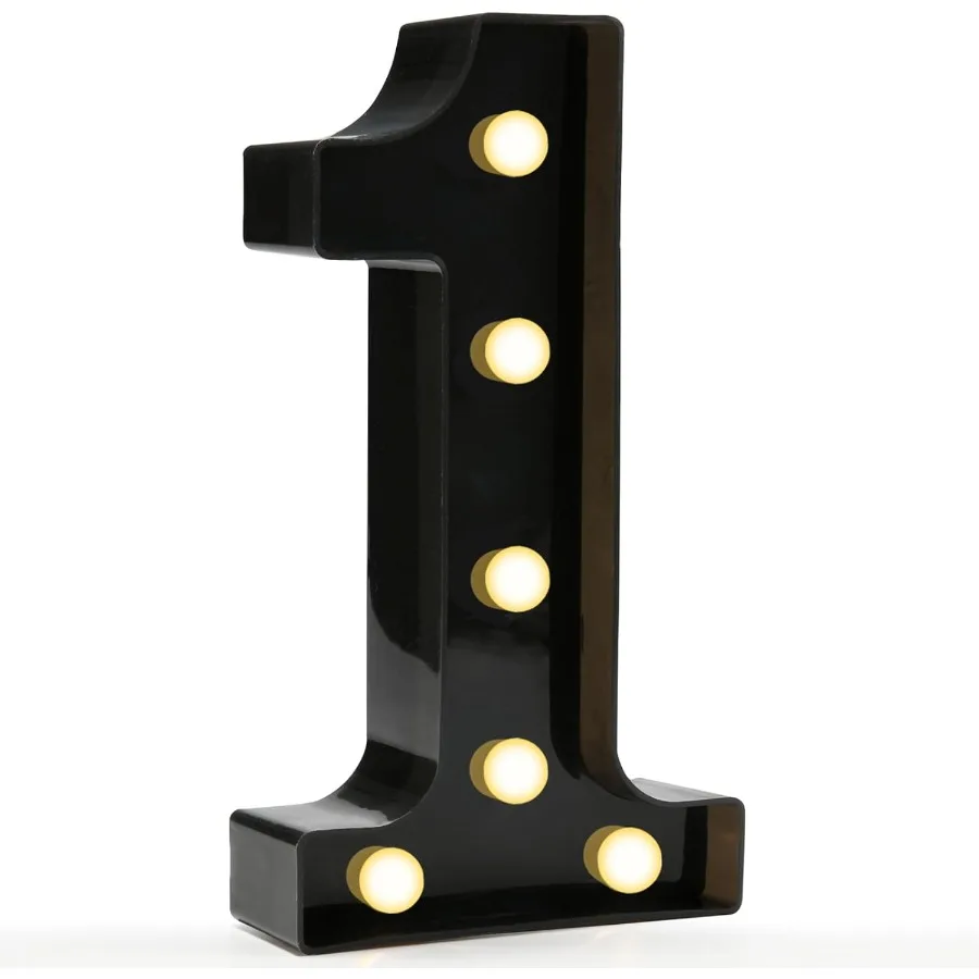 Battery-operated decorative LED light-up number letters in black plastic for 1st 10th 21st birthday party and wedding events pe